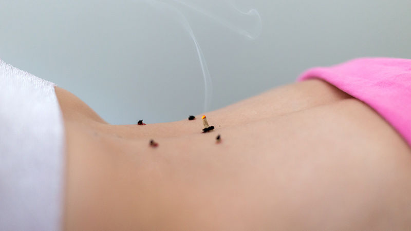 乾燥させたヨモギの葉(の絨毛(じゅうもう))を精製したモグサ(艾)を経穴に置いて燃やし、温熱刺激によって体調を整える治療技術です。